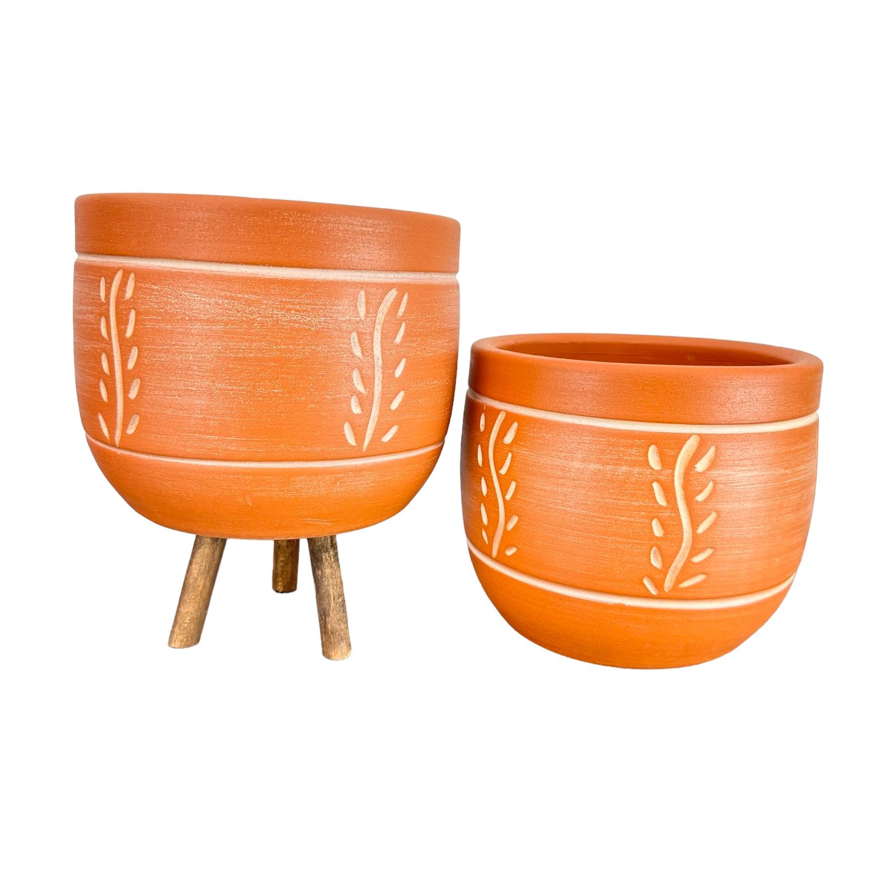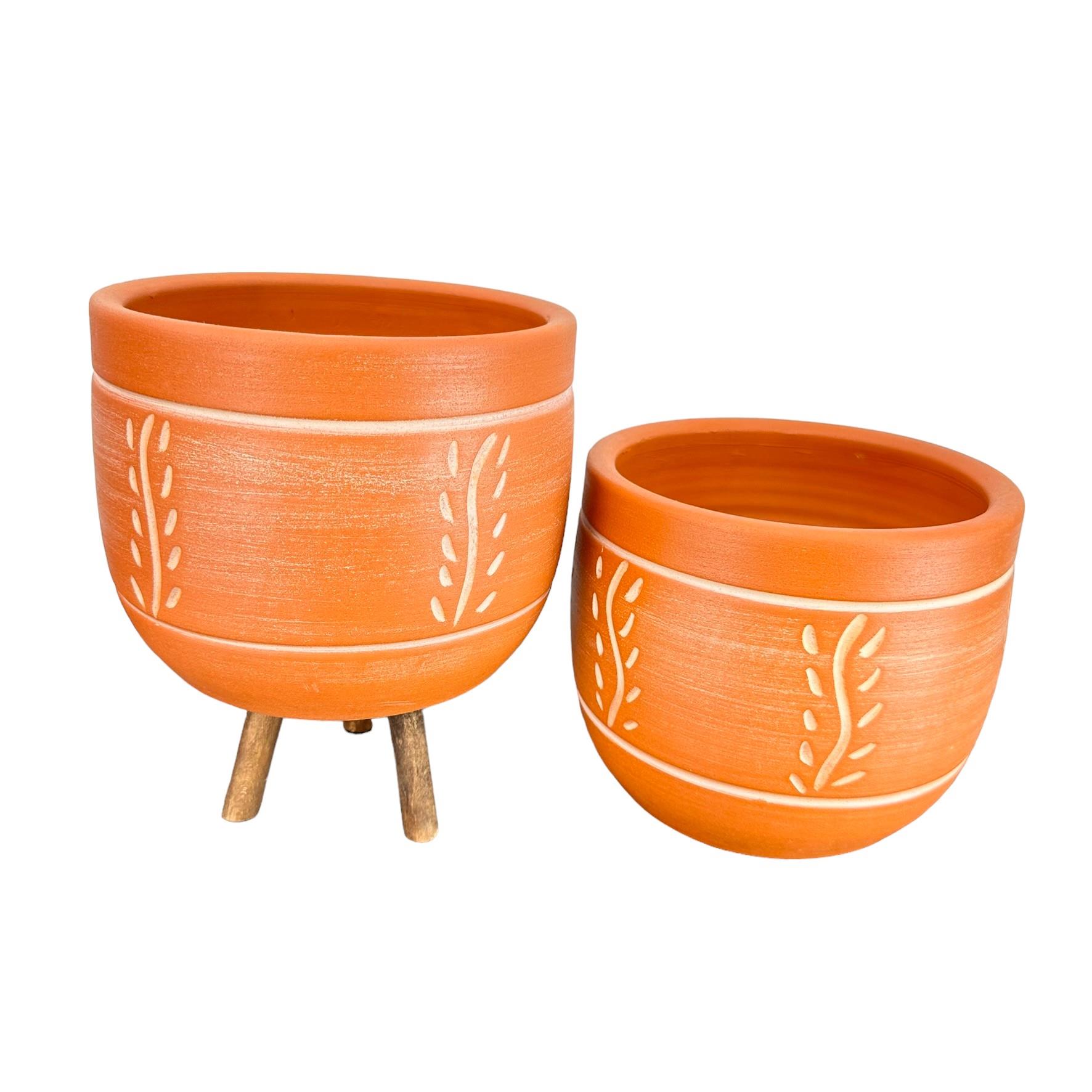 Bitki Tasarımı Doğal Nakış Desen Terrakota Toprak Saksı İkili Set 3 Ayaklı - Ayaksız