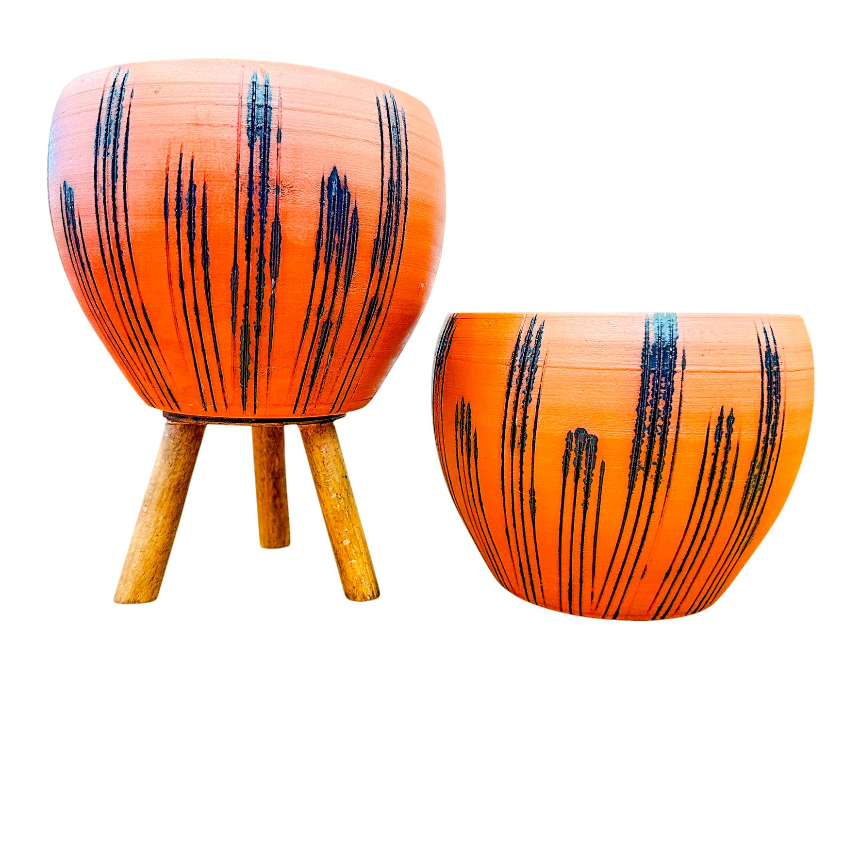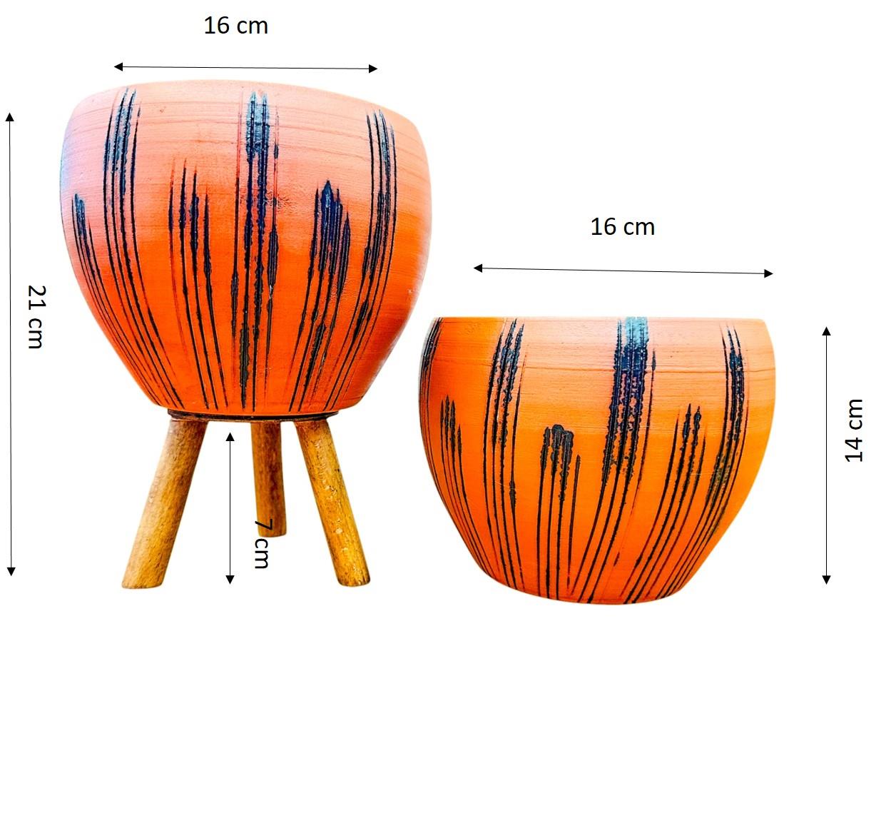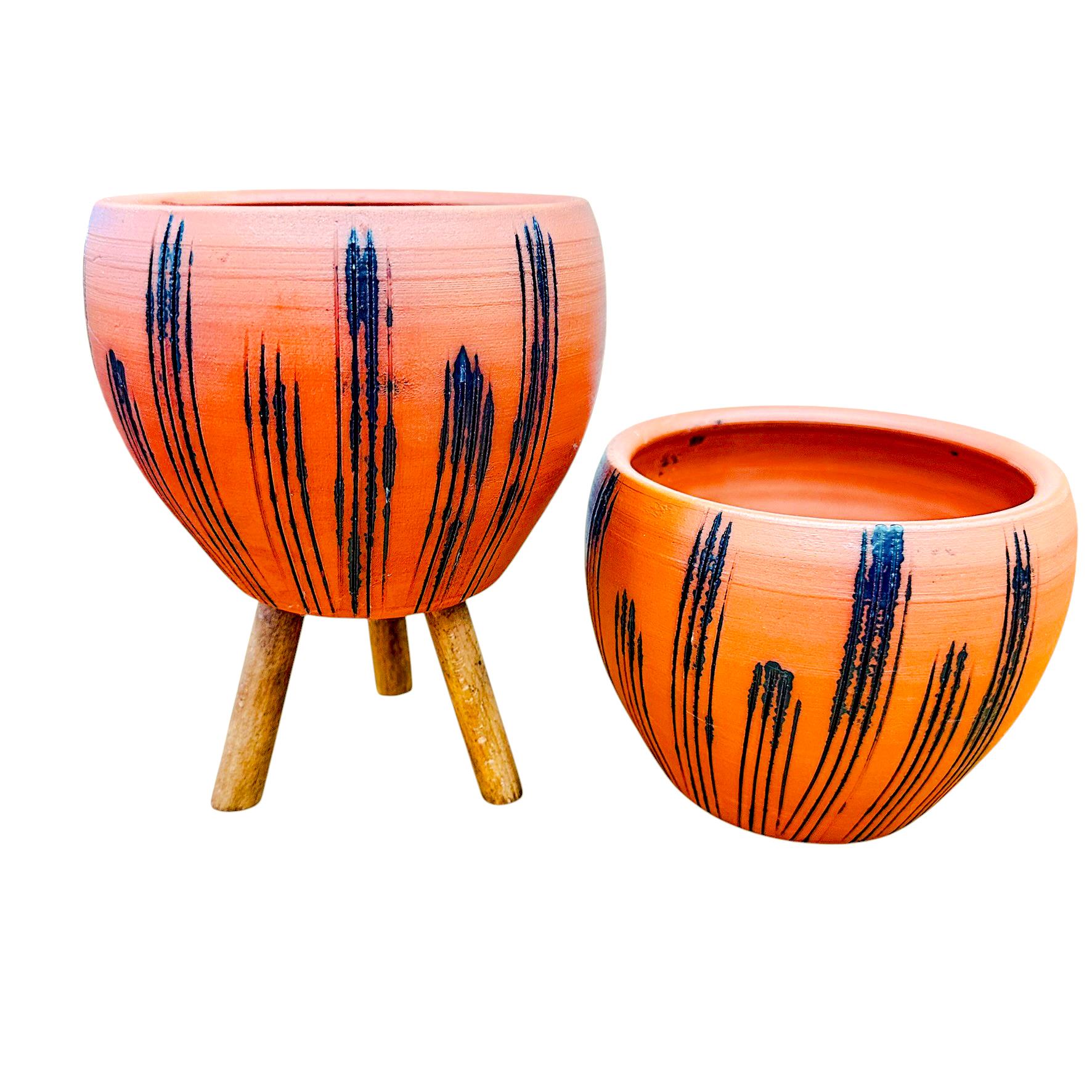 Bitki Tasarımı Doğal Siyah Çizgi Desen Terrakota Toprak Saksı İkili Set 3 Ayaklı-Ayaksız 15 cm